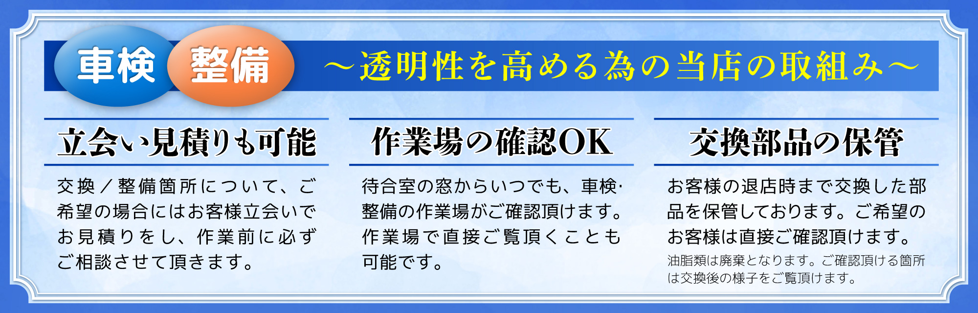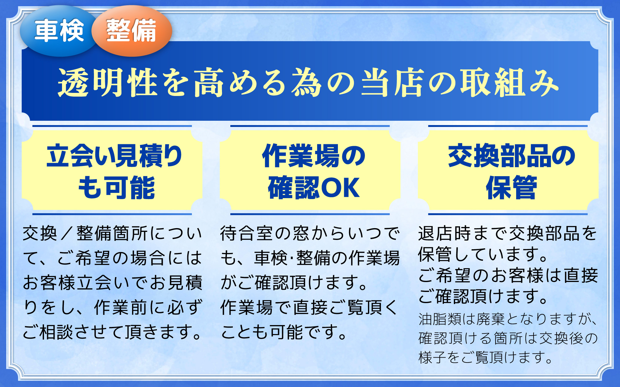 責任をもってお客様のお車をお預かりし、車検を行い、必要な箇所の整備も行わせて頂きます。