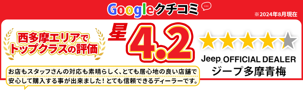 正規のJeepディーラーである私たちの会社では、多くの青梅市・あきる野市・西多摩郡(瑞穂町、日の出町、檜原村、奥多摩町)・羽村市・福生市・昭島市・武蔵村山市・小平市・清瀬市・東大和市・東村山市エリアのお客様のご愛顧を頂き、おかげ様でJeepの車検実施数が累計●台を突破!